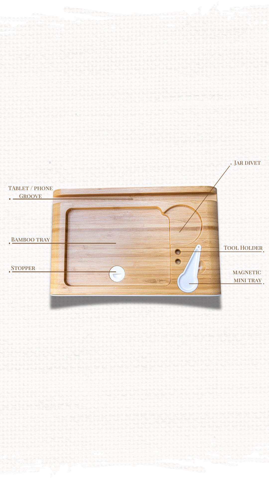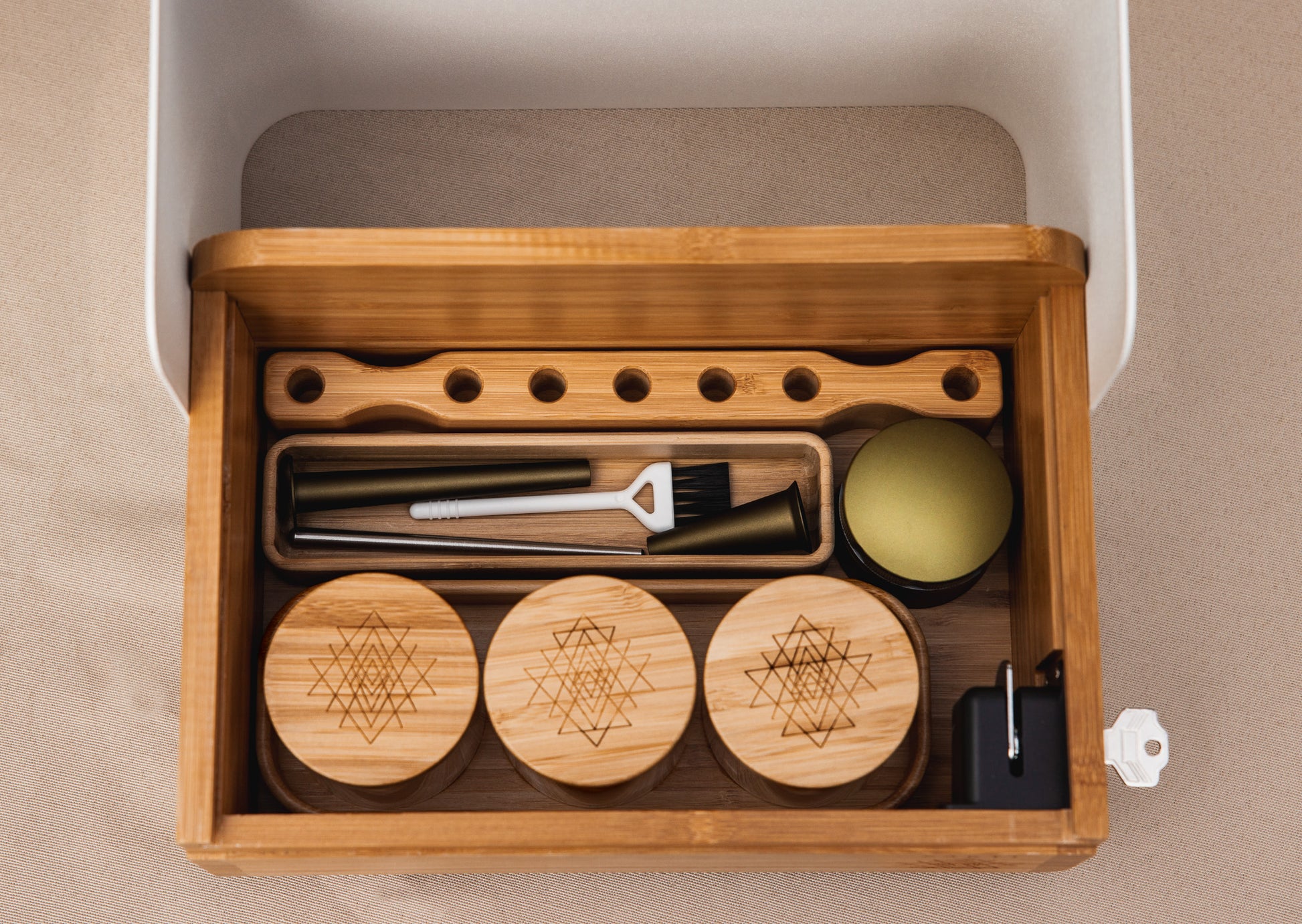 Made from sustainable bamboo, this box is engineered for both beauty and longevity. Packed with thoughtful features—precision tools, airtight glass jars, a smell-proof stash bag, and dedicated storage for every item—it’s built to enhance your sessions for years to come.